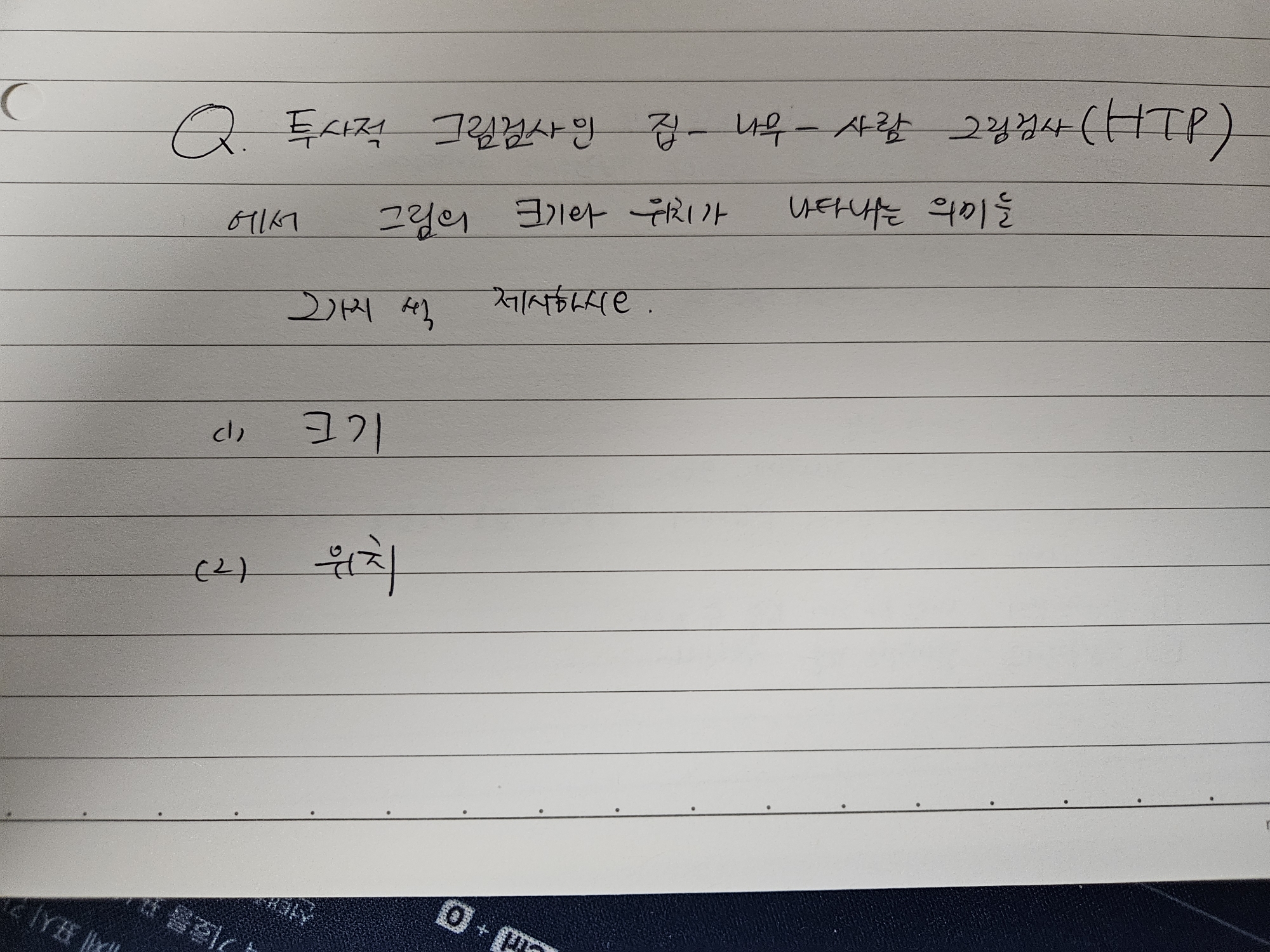 7. 투사적 그림검사인 집-나무-사람 그림검사에서 그림의 크기와 위치가 나타내는 의미를 2가지씩 제시하시오.