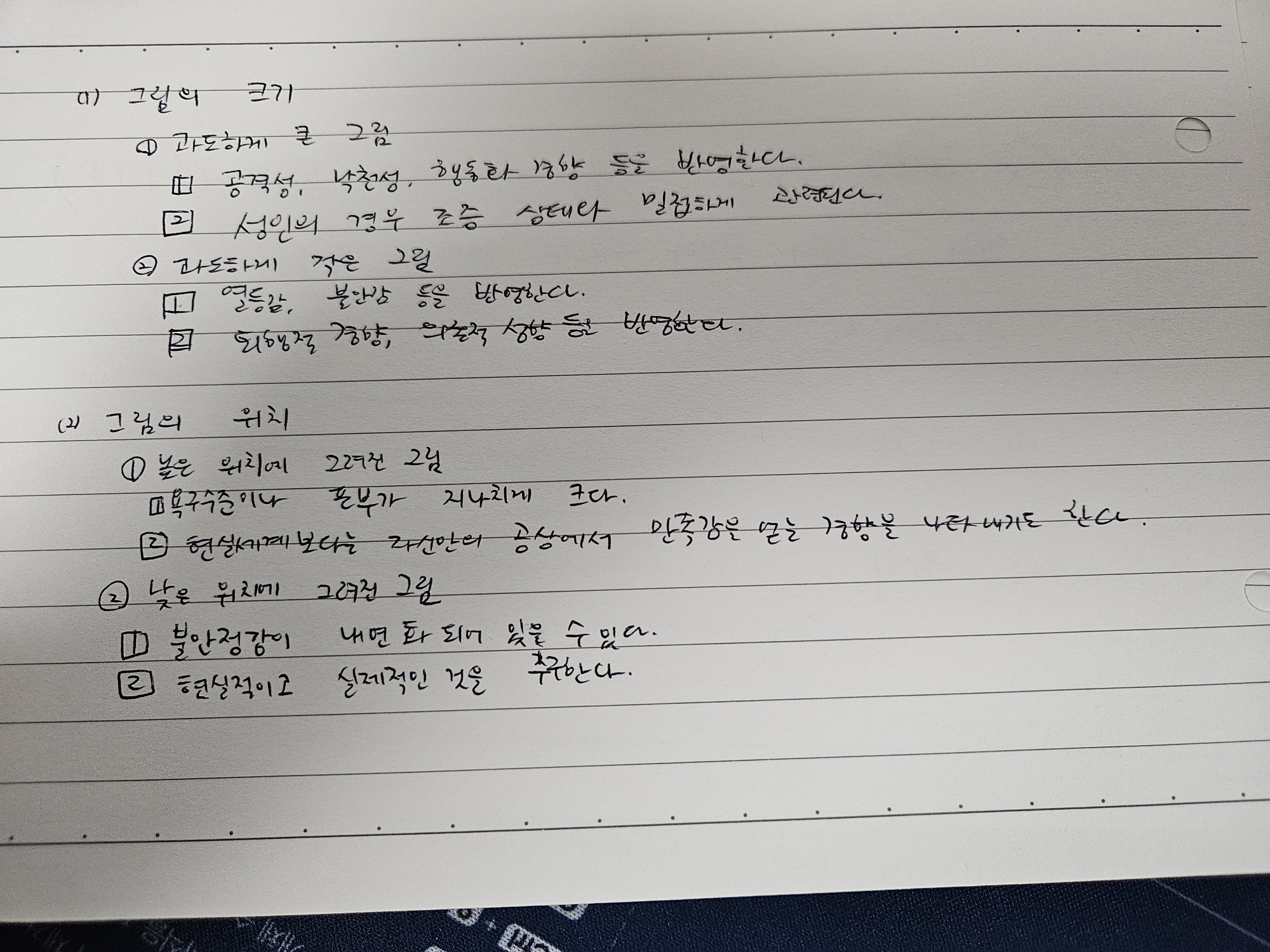 -낮은 위치에 그려진 그림: 불안정감이 내면화 되어 있을 수 있다. 현실적이고 실제적인 것을 추구한다.